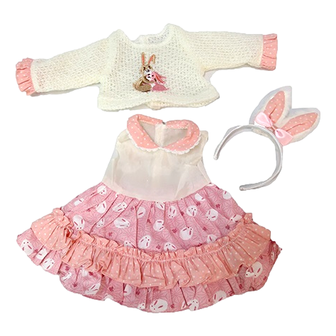 This delightful set includes a pink bunny-print dress, a cozy coordinating sweater featuring an embroidered bunny, and a cute bunny ears headband to complete the look. With soft fabrics and playful details, your doll will be dressed to impress for all her Easter adventures.